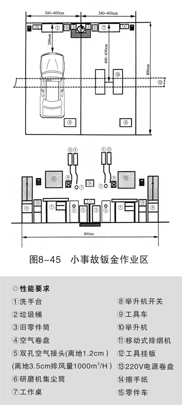 小事故作業(yè)區(qū)視維修業(yè)務(wù)量安排2~4個工位,每個工位設(shè)備設(shè)施齊全,能獨(dú)立完成板件損傷修復(fù)。